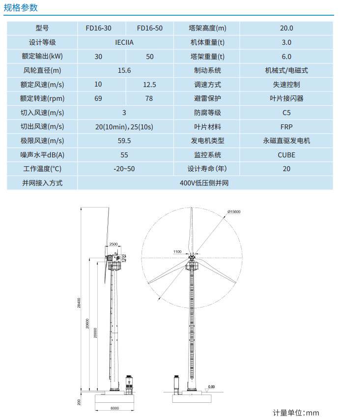 FD16系列风力发电机根据IEC61400-2标准设计,扫风面积191平方米;